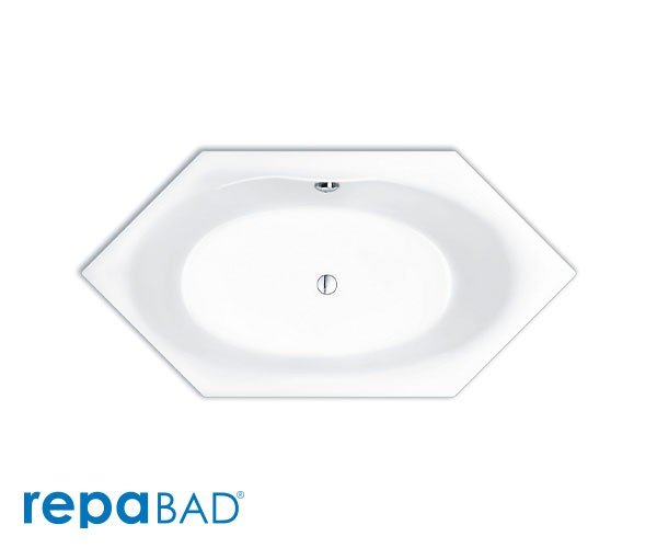 Eine klassische Sechseck-Badewanne. Die Stirnseiten haben unterschiedliche Schrägen, damit man je nach Lust und Laune sowohl bequem sitzen als auch entspannt liegen kann.